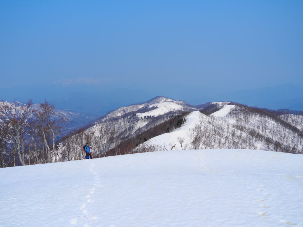 五十母清水の先で雪が繋がり始める。人分山への登りで振り返ると、阿賀野川から上がってくる靄が集落を覆い隠し、山だけが浮かんで水墨画のようだ。奥に五頭連峰がぼんやりと宙ぶらりんになっている。