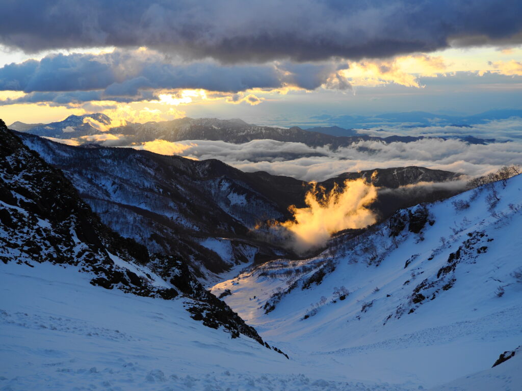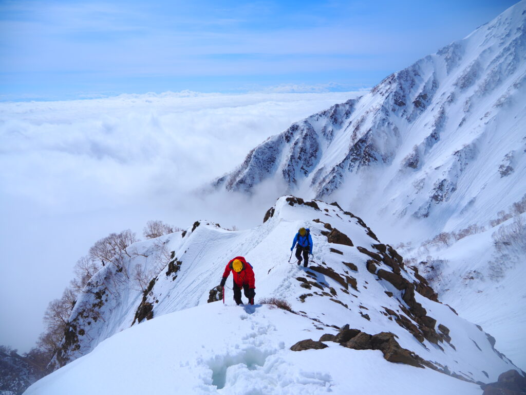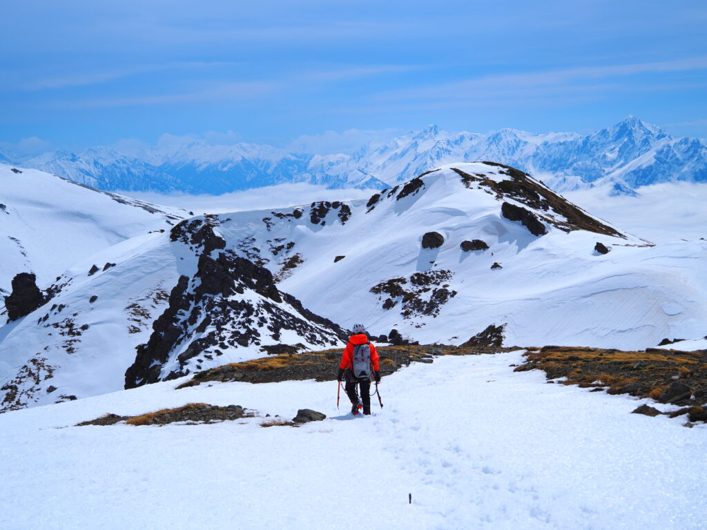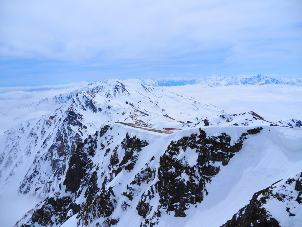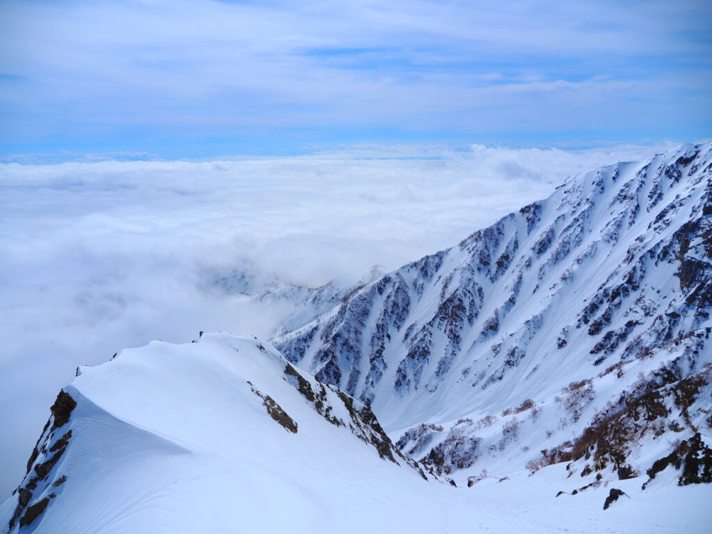 雲海にぷかぷかと浮かぶ雪稜はまるで船に乗っているかのようだ。夢見心地でもはや眠くなる。それでも、日本離れした雄大な景色が眼前の情報として飛び込んできて、はっと目覚めさせられる。流石は白馬、素晴らしいロケーションである。