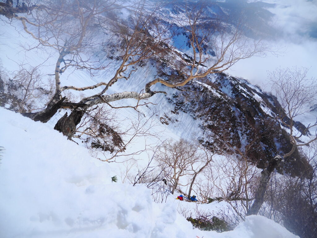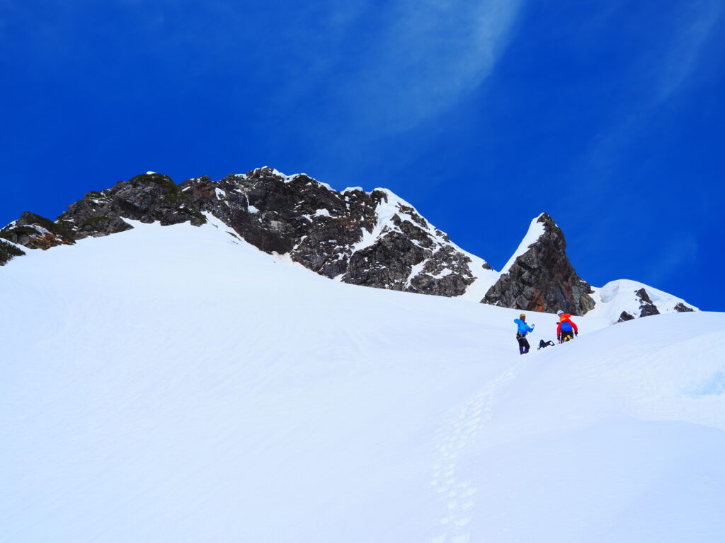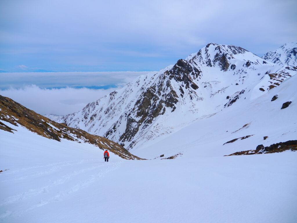 ここから傾斜が緩み、フリーで進む。容易な雪稜をズボズボと踏み抜きながら進み、ルンゼをザラメラッセルしながら詰めていく。