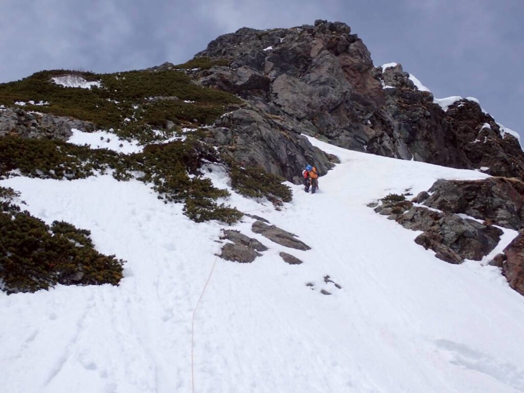 ハイマツ混じりの斜面から脆いルンゼを詰めて頂上直下まで。