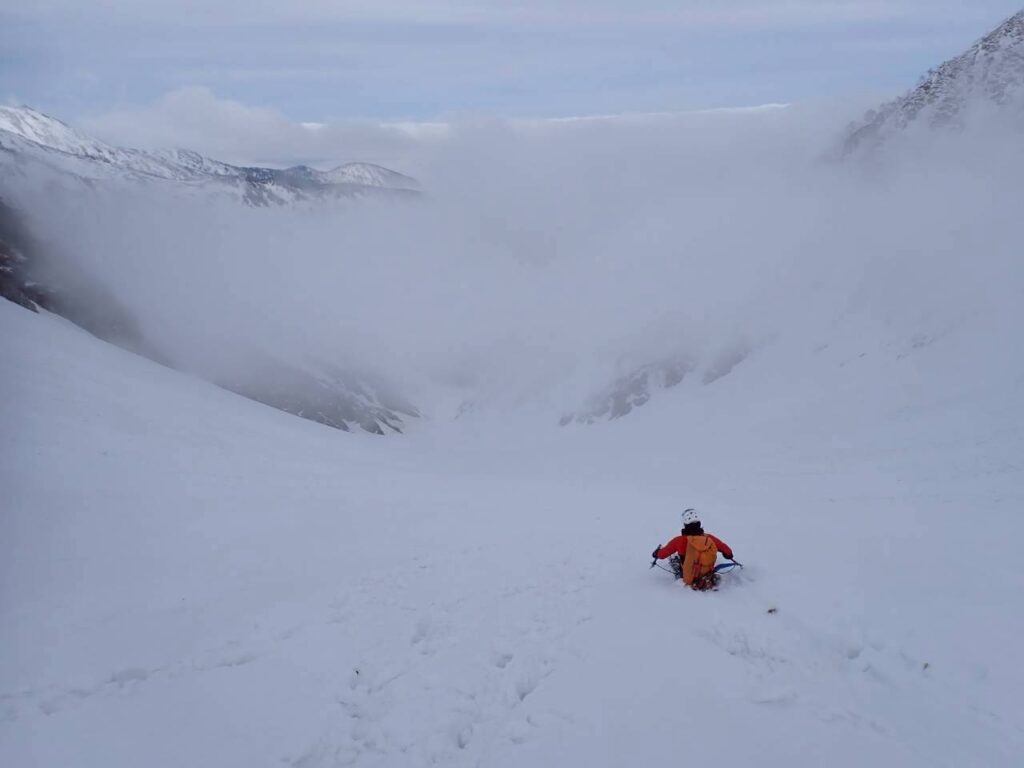 頂上稜線の雪庇は無く、すんなりとトップアウト。ものの1分で山頂に着く。やっぱり山頂にダイレクトに突き上げるのはラインとして美しい。山頂からは剱岳がひときわ目立つ。深い黒部の谷は真っ白なガスの羽毛布団に覆われ、黒部別山が毛布に包まれながら顔を出している。