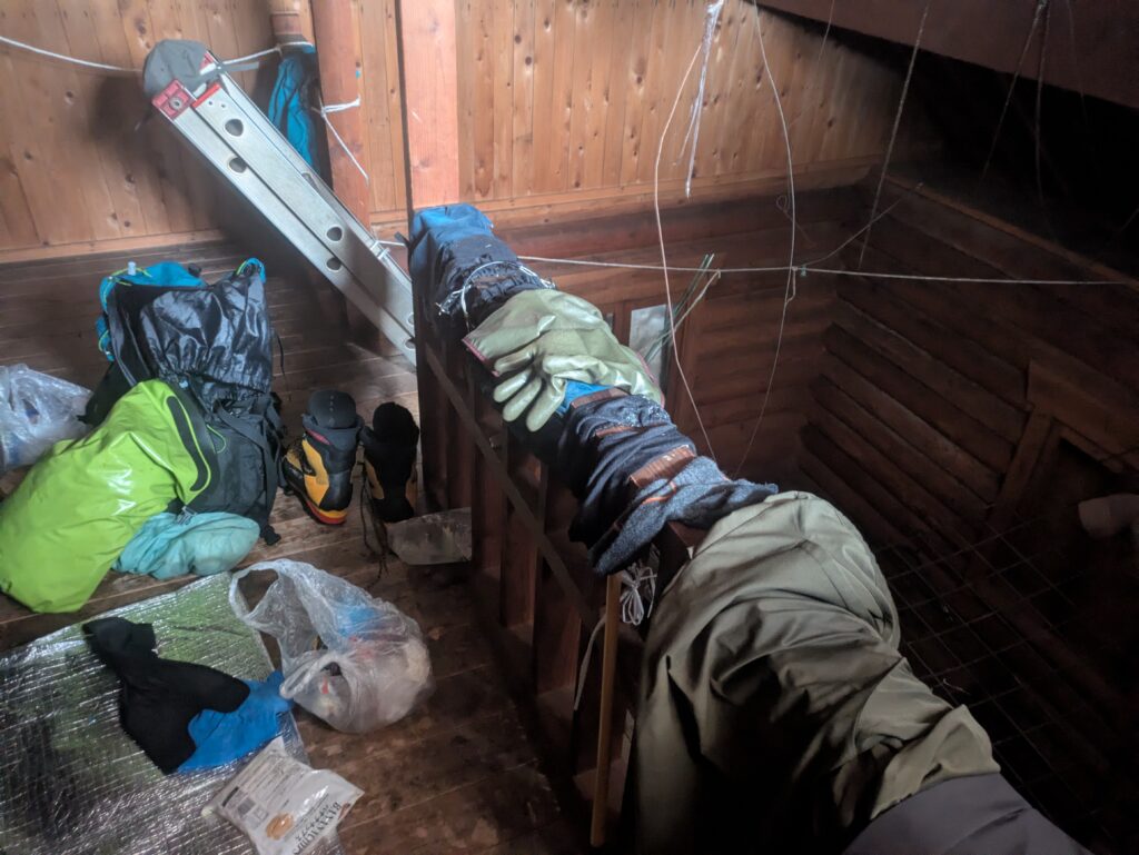 祝!丸山岳登頂!とか言いながら、餅入りラーメンにウインナーをぶち込んだ。ボイルしたウインナーがバカみたいに美味い。外は烈風が唸っているのに、NHKのラジオは「くつろぐ」ことをテーマとした謎の俳句が流れている。混沌とした気分でくつろぐ。薮漕ぎで消耗していたのもあり、おそらく17時代に撃沈。寒冷前線が通過したのか、夜は嵐になった。クロスオーバードームは浸水祭りだ。浅い眠りの意識下で、時折水滴がひたりひたりと頬を伝うのが分かったが、なるようになる、そう微かに思いながら眠った。