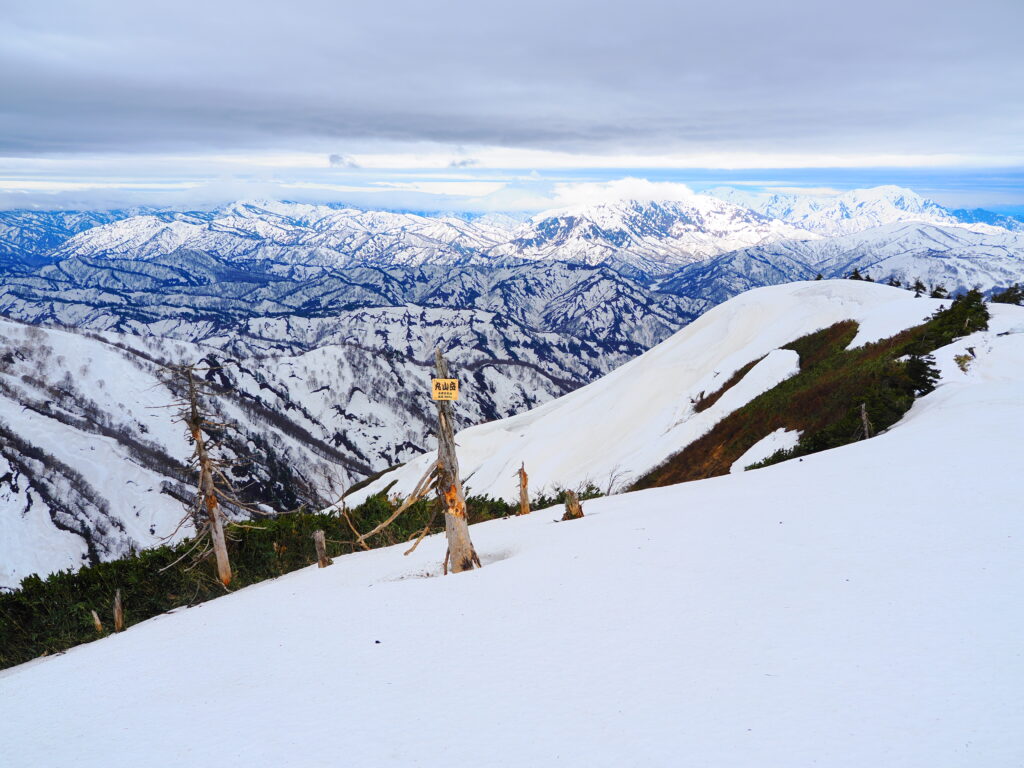 テン場から5時間弱かけて丸山岳の山頂に立つ。その名の通り、まるっとしていて穏やかな頂だ。天気も持ちこたえてくれた。感傷に浸りたいが、水を差された。誰かが取り付けたのか、今までの記録にはなかった山頂標識があった。この山にはそぐわない。丸山岳のような山は、行き着いた果てに山だけが其処にあるのが良いのだ。