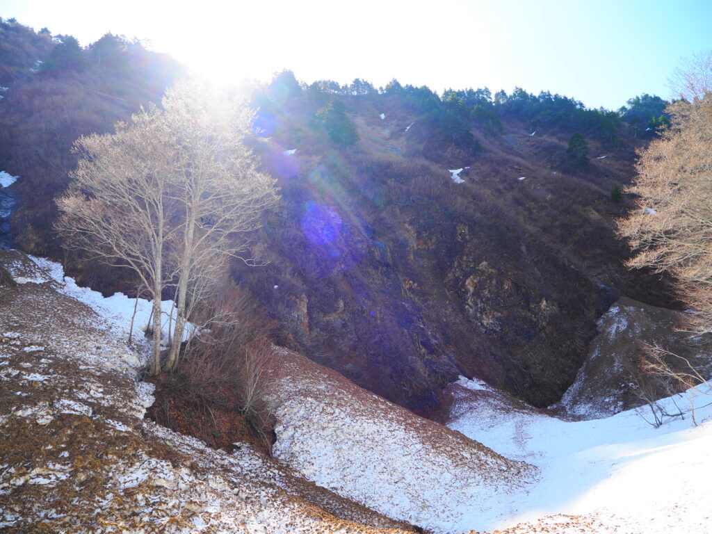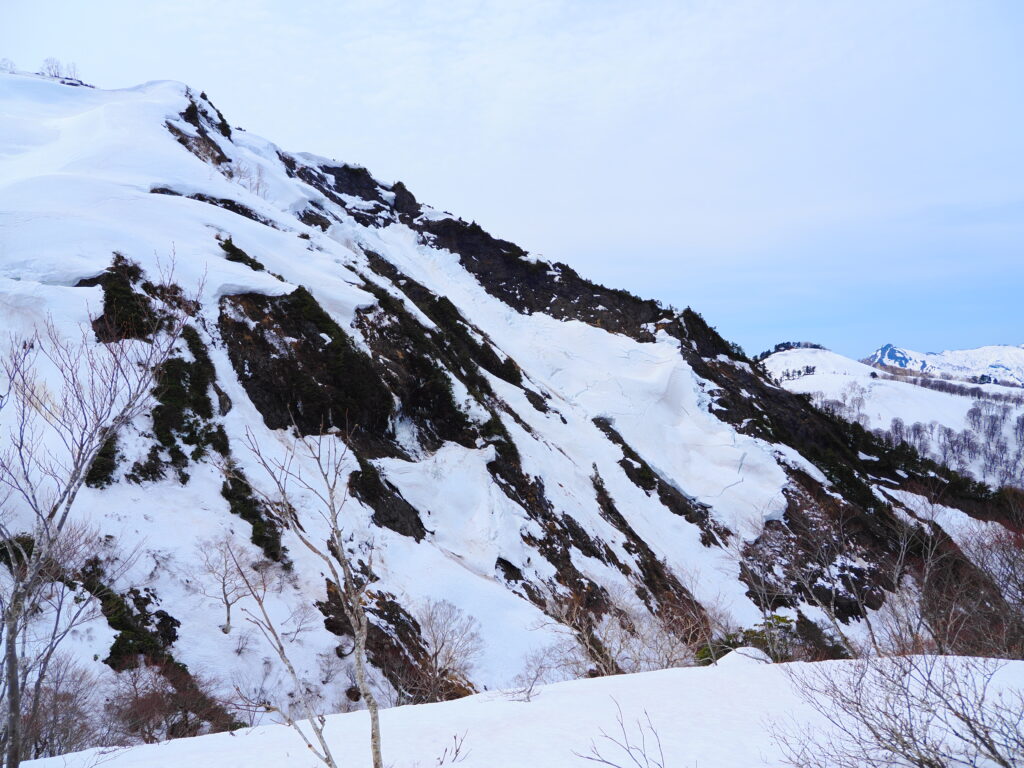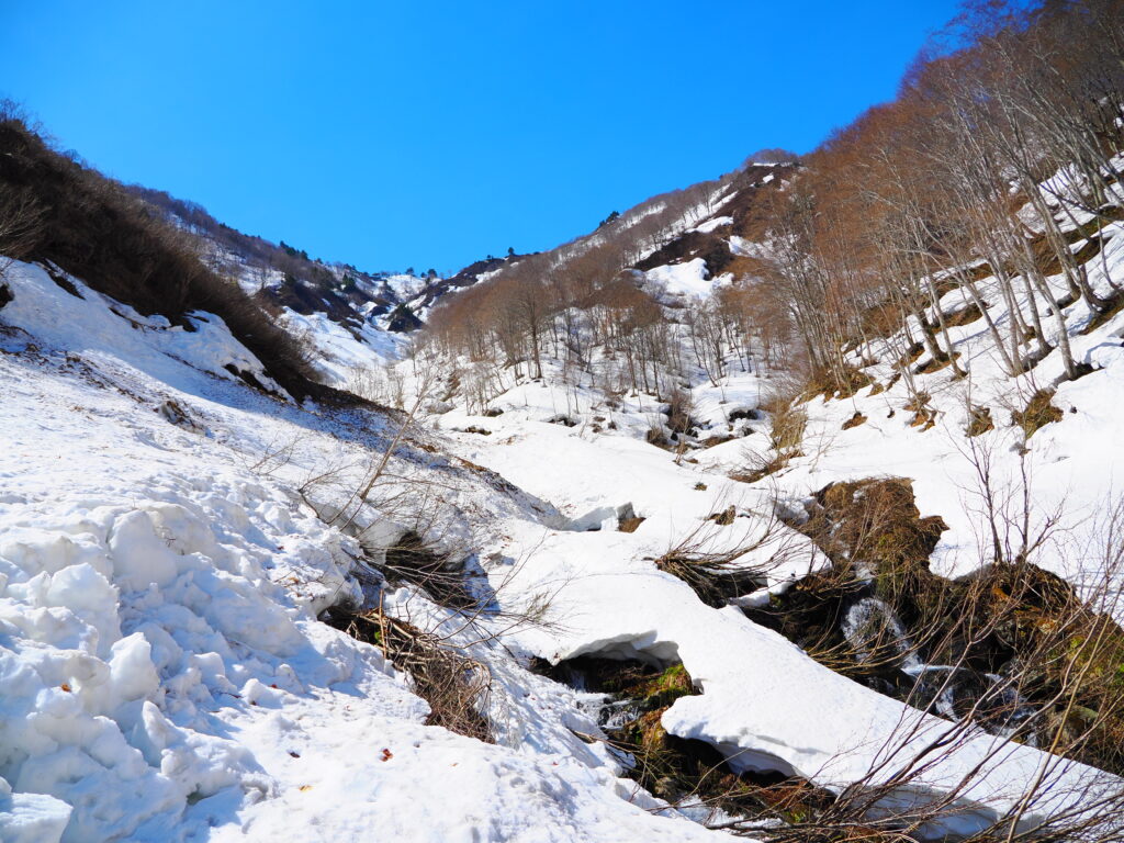 燻んだ季節だというのに、澄み切った青空が広がっている。どんな山でもはじめの一歩は少し重たいものだが、今日は青空が山に誘ってくれている。赤倉沢の側壁の雪はほぼ落ちており、大砲に撃たれる心配は殆ど無い。ふきのとうを摘みながらポレポレと歩く。