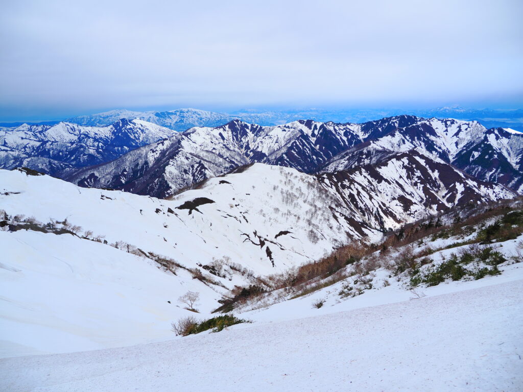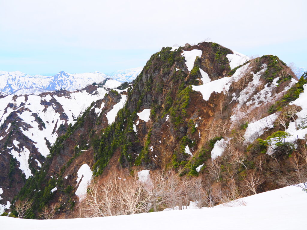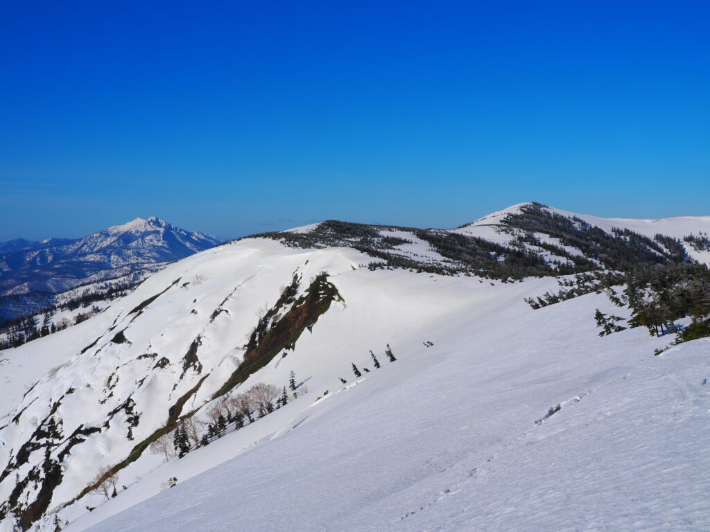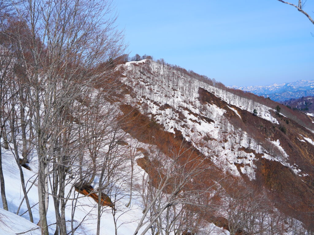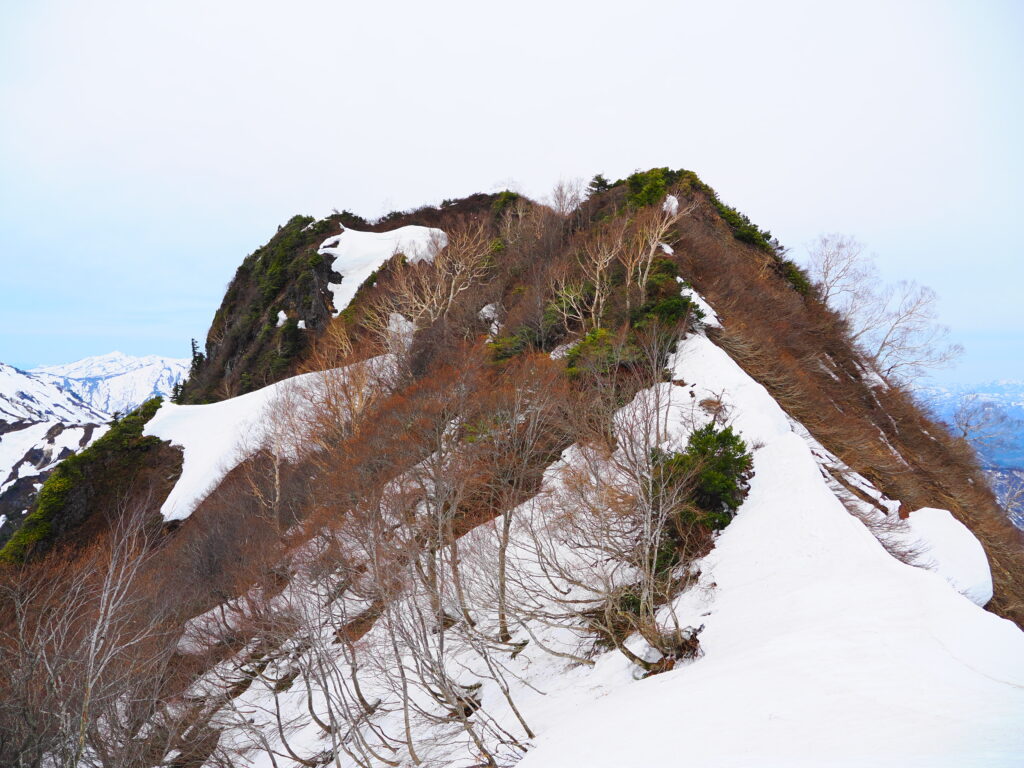 大クロベを見送り、小ピークをトラバースする。避難小屋の前をうさぎがひょいと1羽跳ねていった。3週間前に登った会津朝日岳の北稜は、すっかり雪が落ちていて薮尾根と化している。