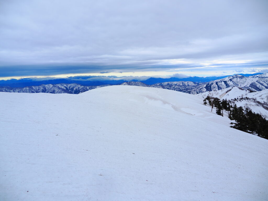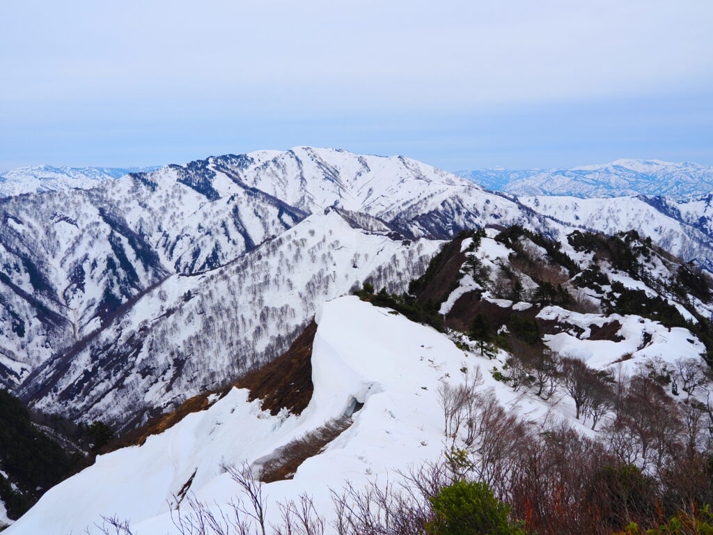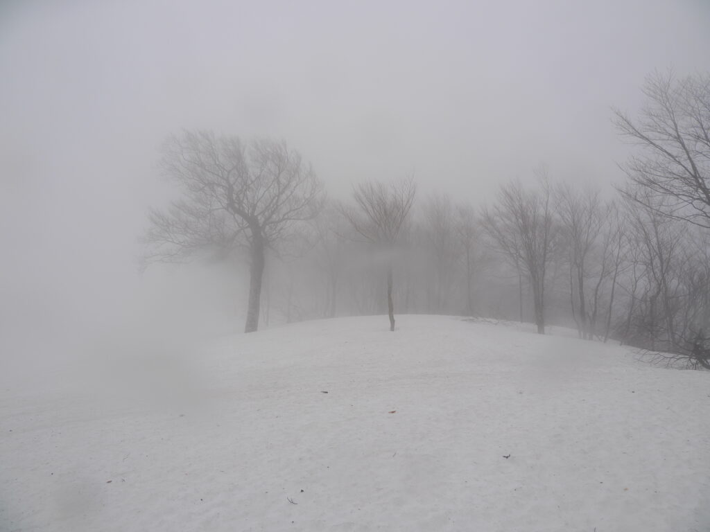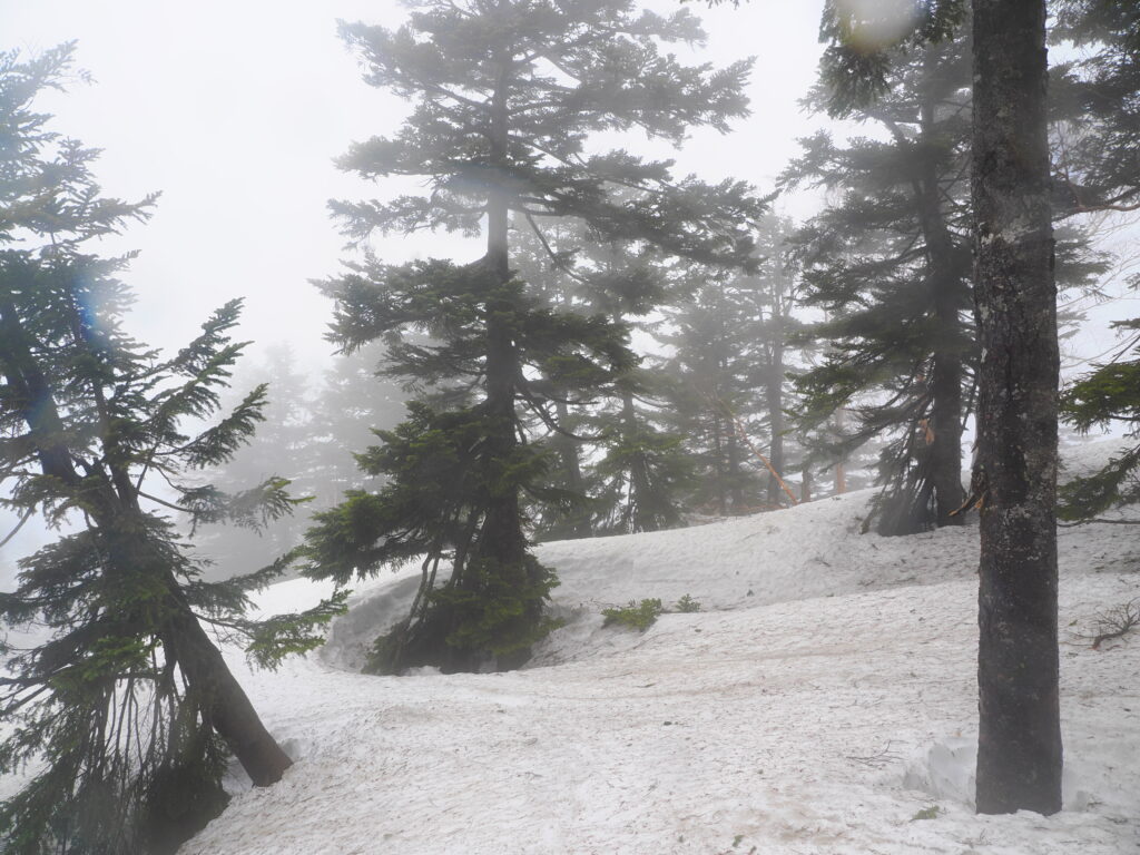虚無の尾根を行く。ワンポイントだけギャップに阻まれ、雪壁登りがあった。坪入山の手前など巨木の針葉樹林帯で、条件が良ければおそらく非常に雰囲気が良さそうだが、ガスで5m先しか見えぬ。窓明山の直下は低灌木帯の踏み抜き地獄だ。もう薮はいい。