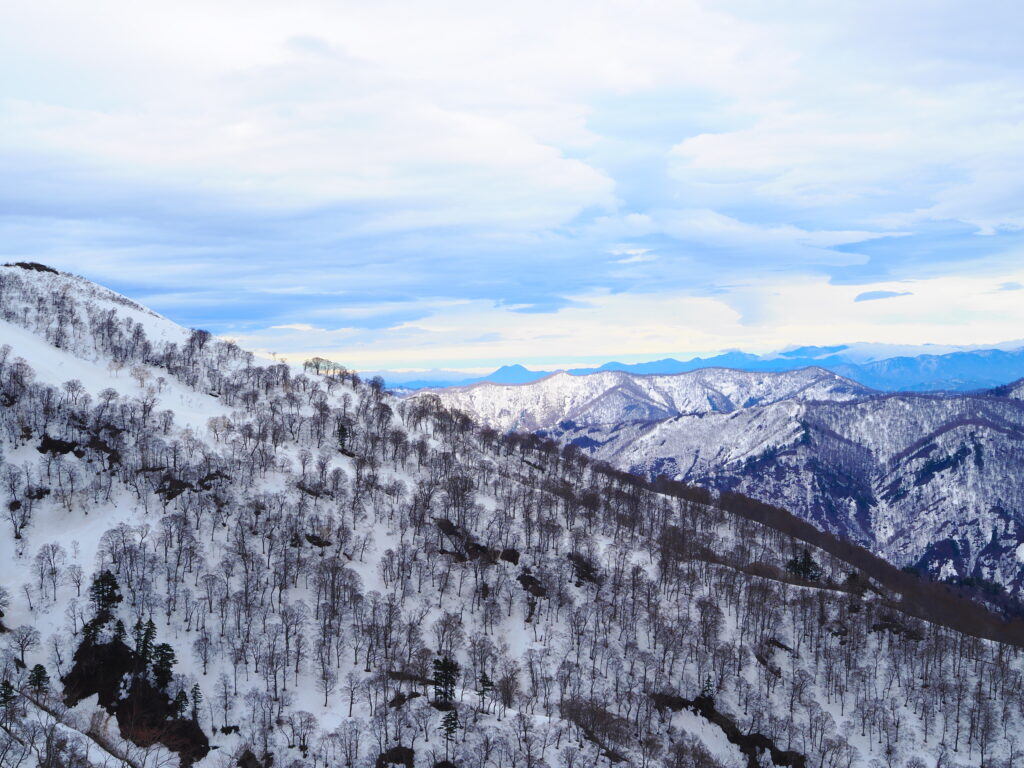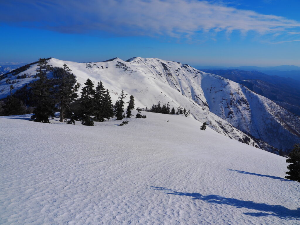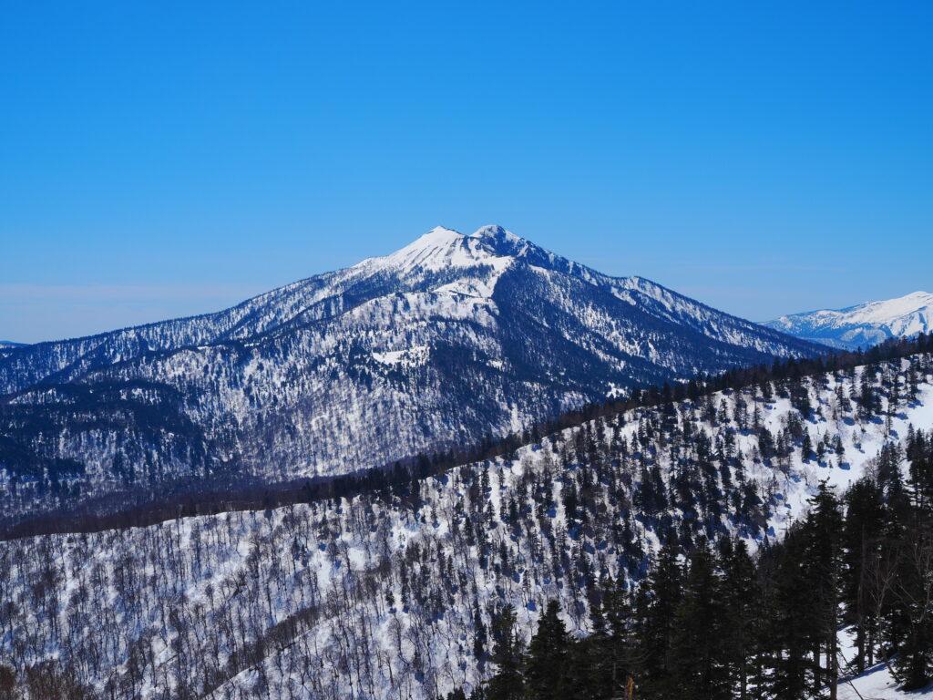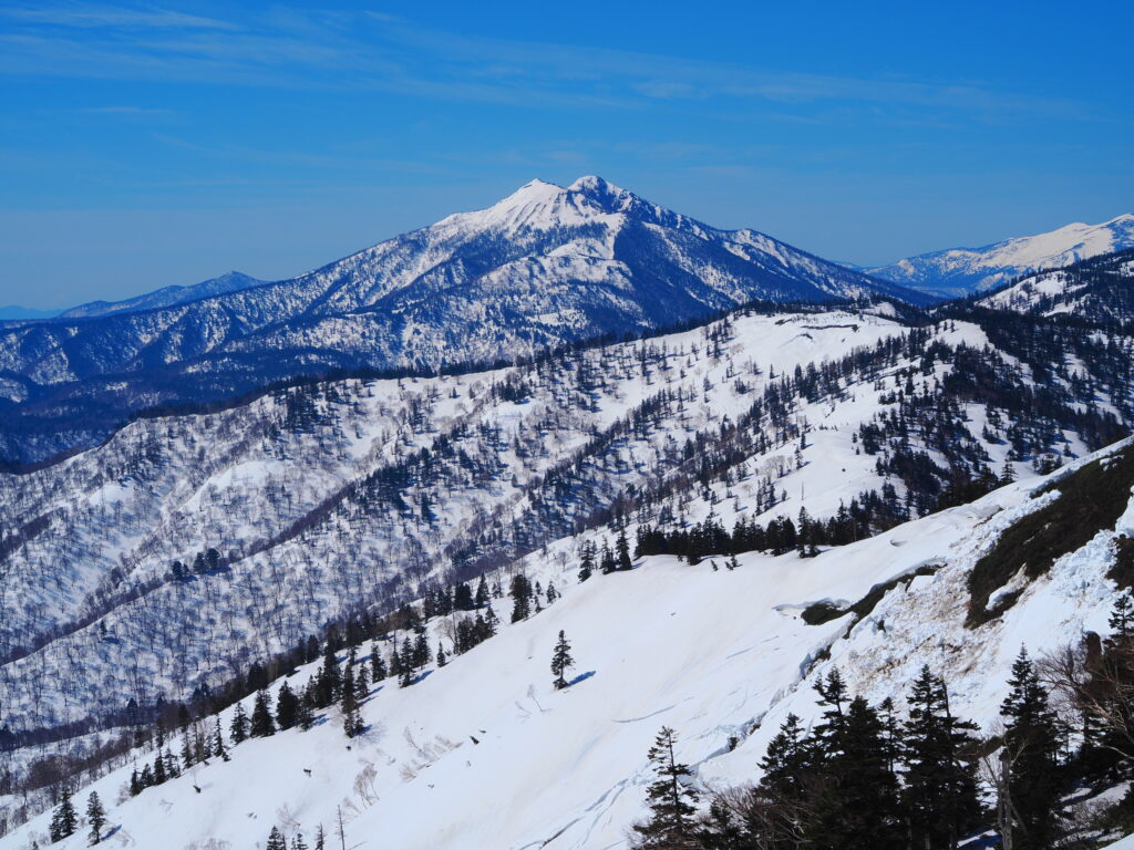 Co1723mのピークから、夏に遡行した西実沢を眺める。雪で埋まった谷に吸い込まれそうになる。思い出に浸りながら、ひと登りで梵天岳へ向かう。火奴尾根がよく見える。いつか歩きたいなあ。二岐山の2つの耳が目立つ。そういえば会津朝日からずっとチラチラと存在感をアピールしていた。何だか可愛らしい。