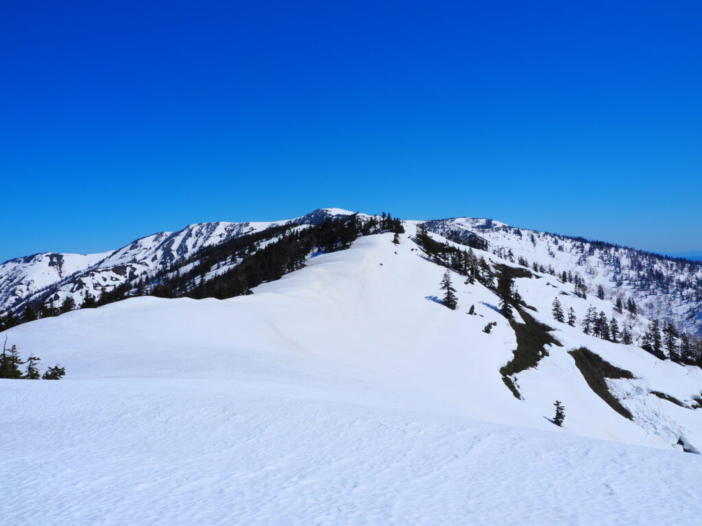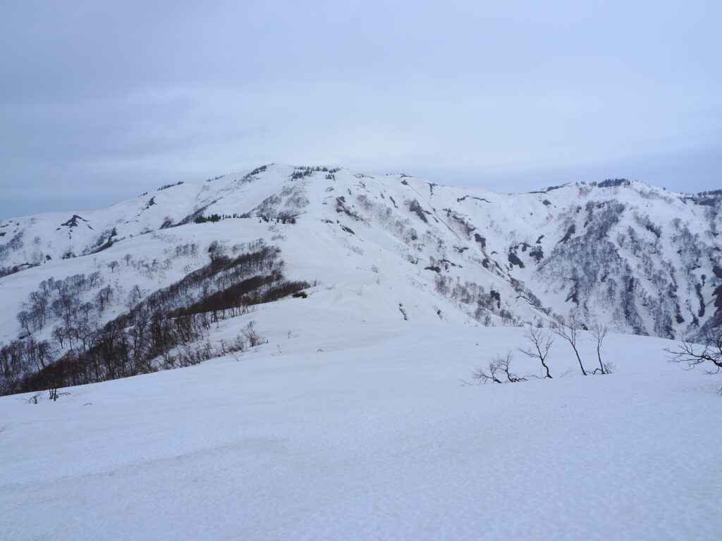 鋸刃を越えても雪がない。ラッセルはそこそこ好きだが、藪漕ぎは苦手だ。キタゴヨウの大木があったが、写真を撮る余裕もなかった。技術的に難しいわけではないが、体力が奪われ、消耗する。纏わりつく薮の海を必殺の犬掻きで泳ぎきり、ヘロヘロになりながらもCo1467mのピークで幕。