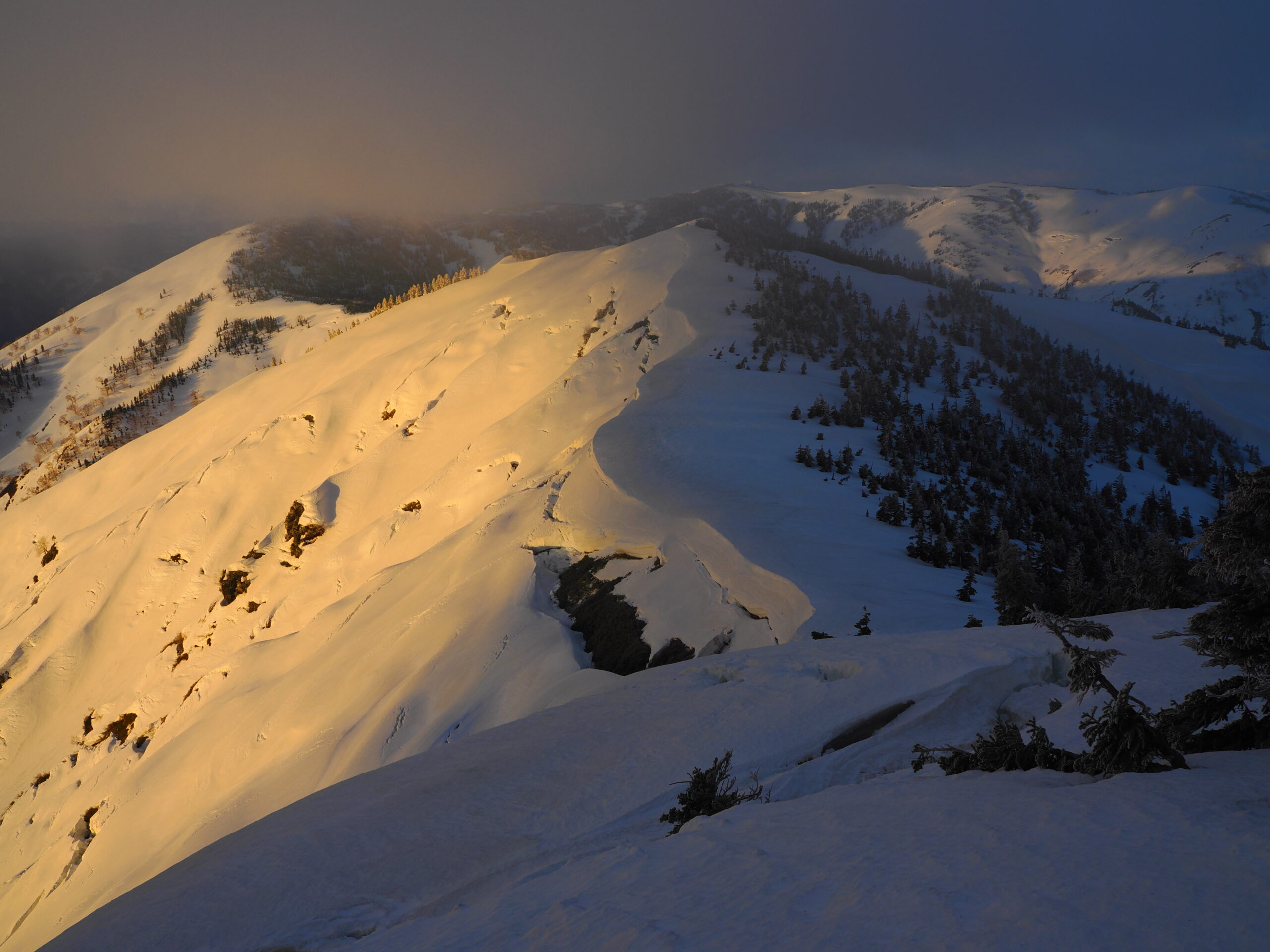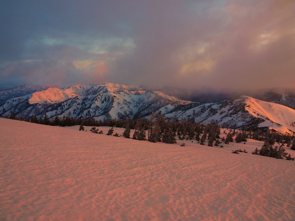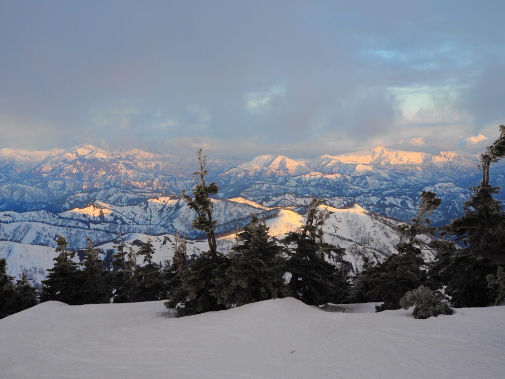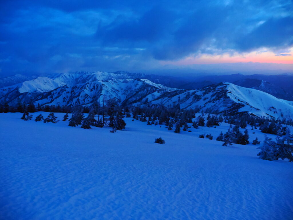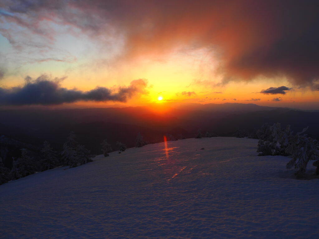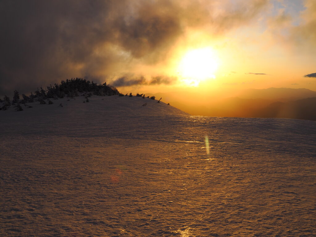 その瞬間、日が昇った。南会津の山が紅く染まる。なんて美しいのだろう。この時だけは、目の前の紅く染まった世界と、ちっぽけな僕しか存在しなかった。ぐしょ濡れに濡れた靴、薮に消えたテムレス、アイゼンで引き裂いたスパッツ、そんなことは朝日が全て忘れさせてくれた。ただ、無心で目の前の景色を食い入るように見つめた。ふと我に返ったとき、あぁ、ここまで歩いてきて良かった、と心から思った。