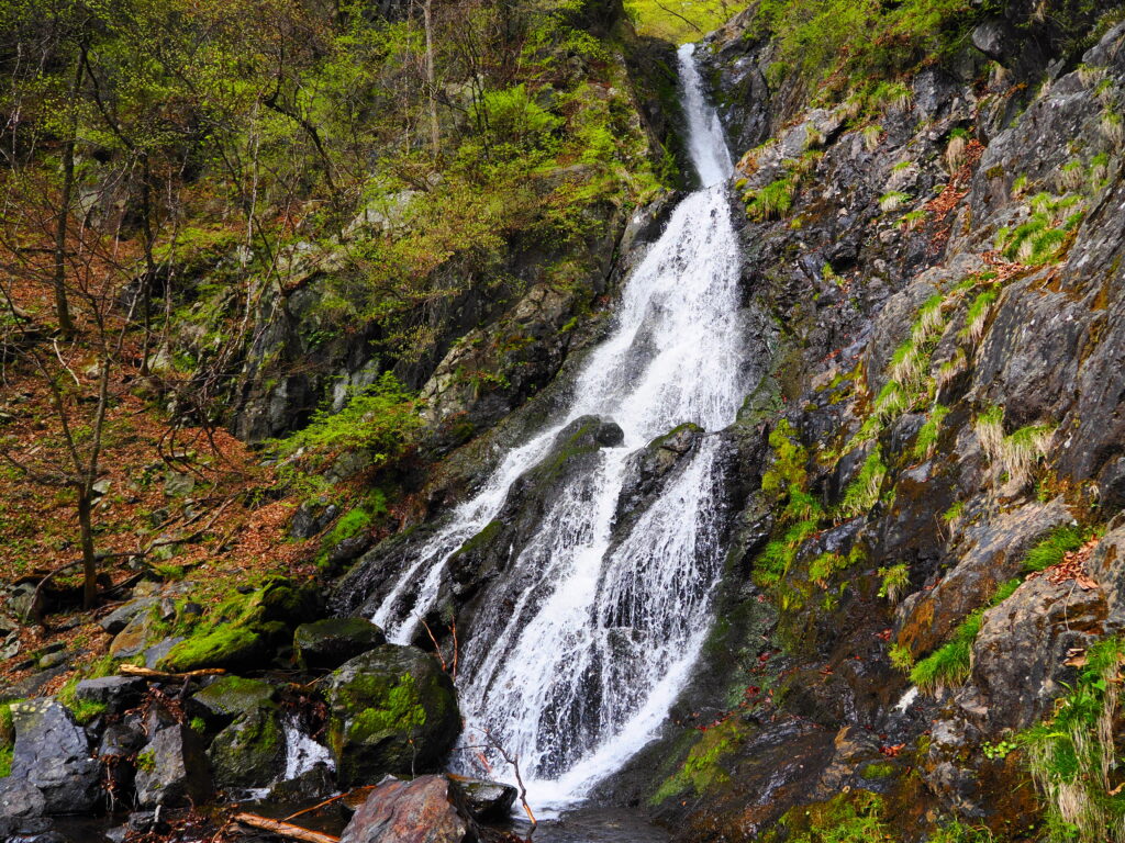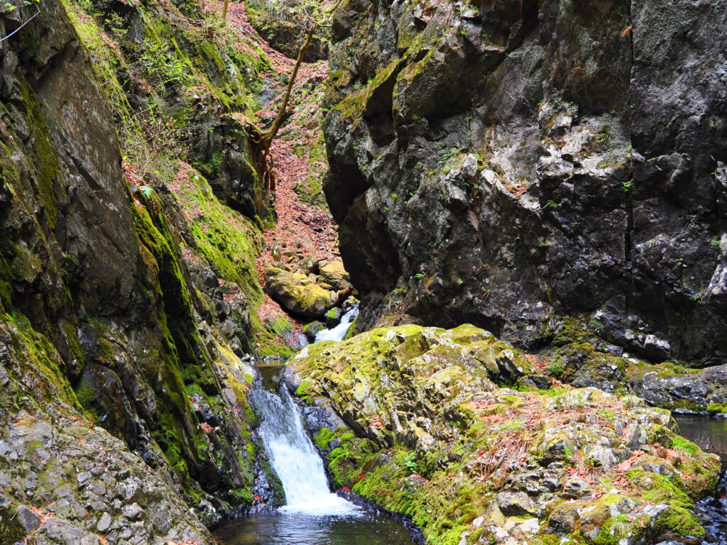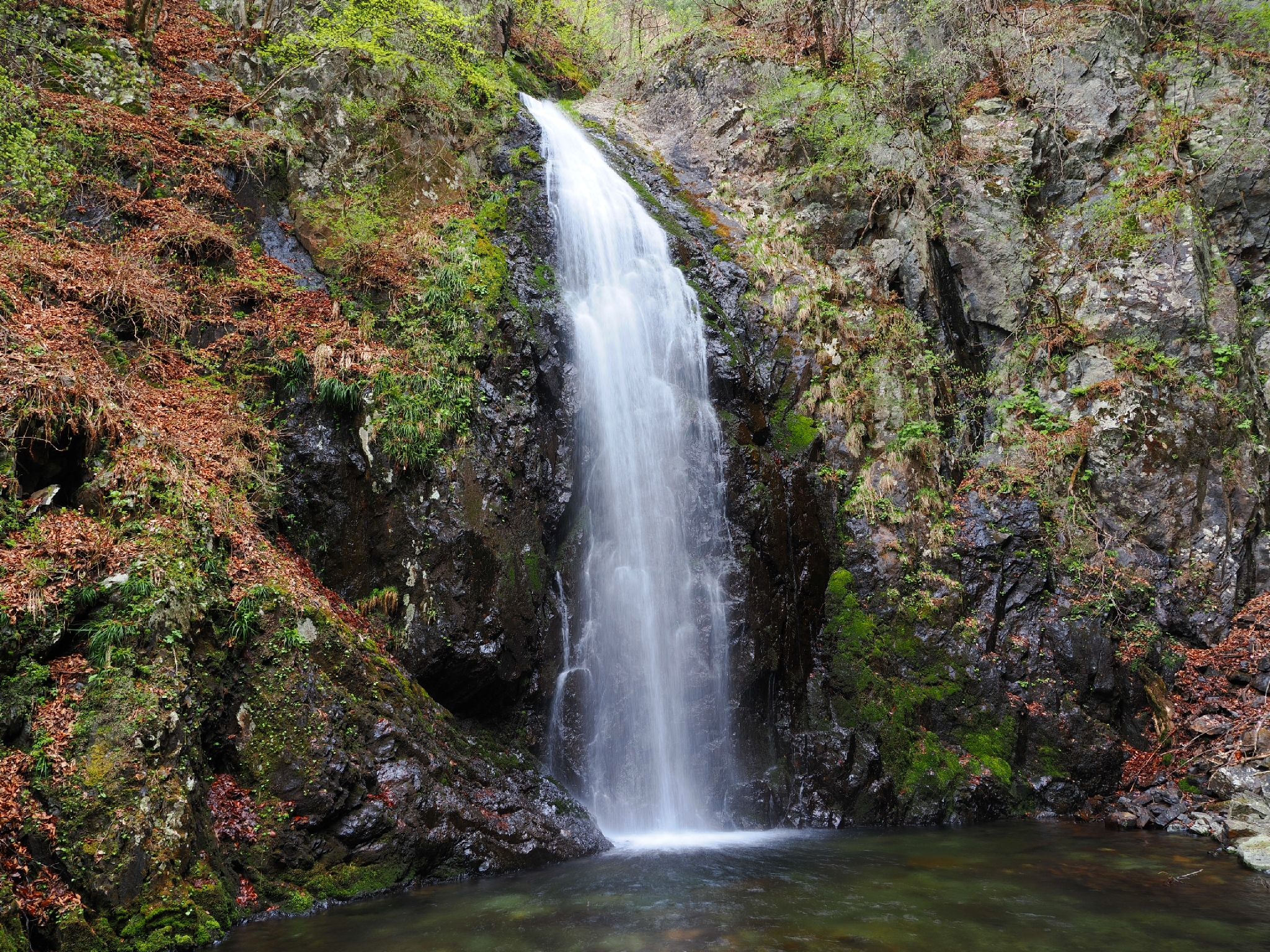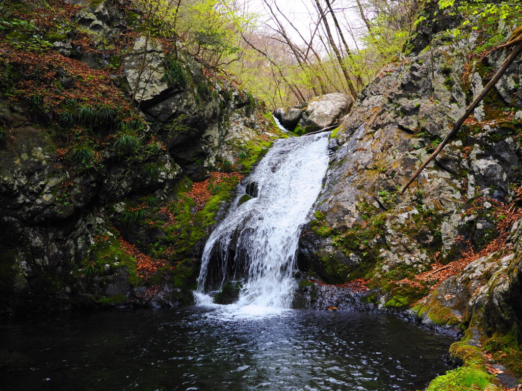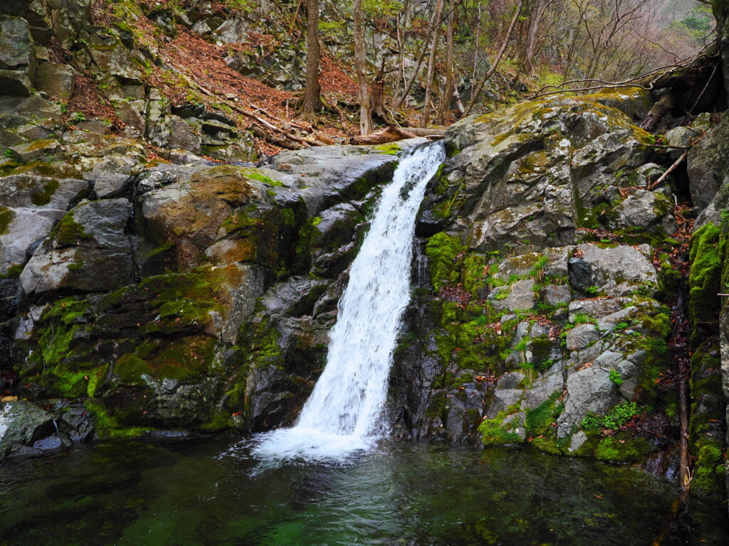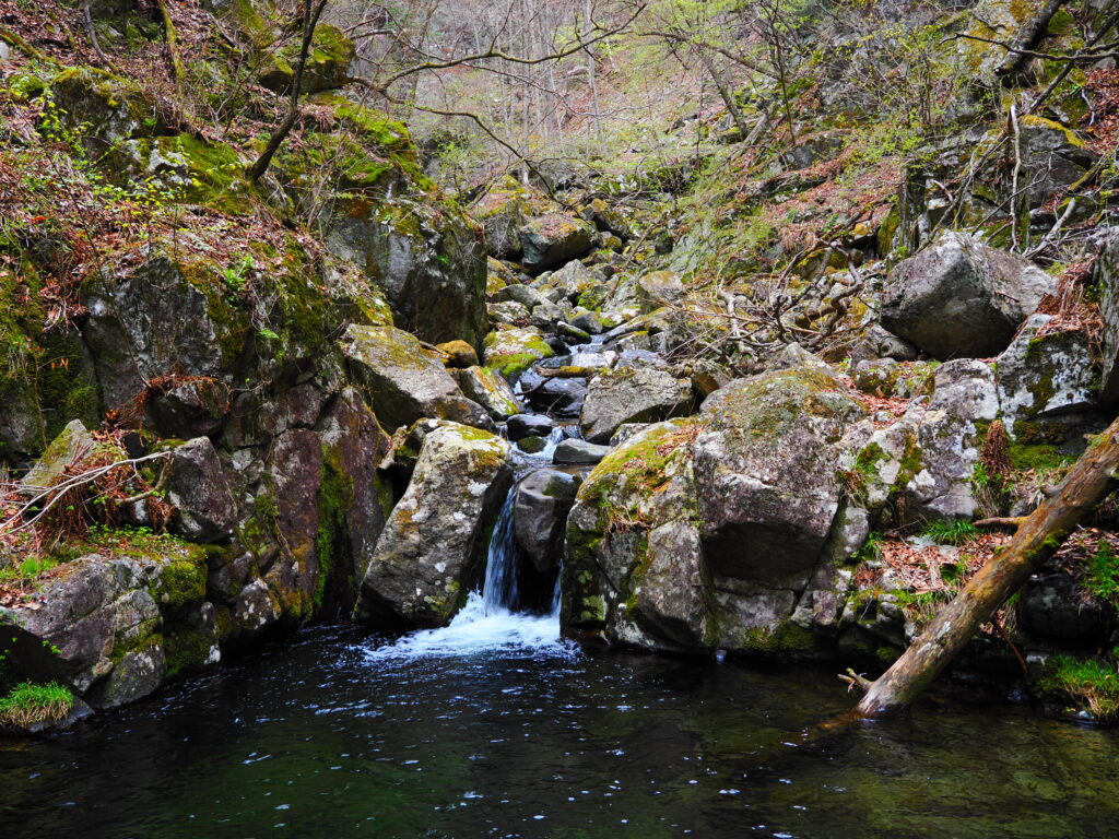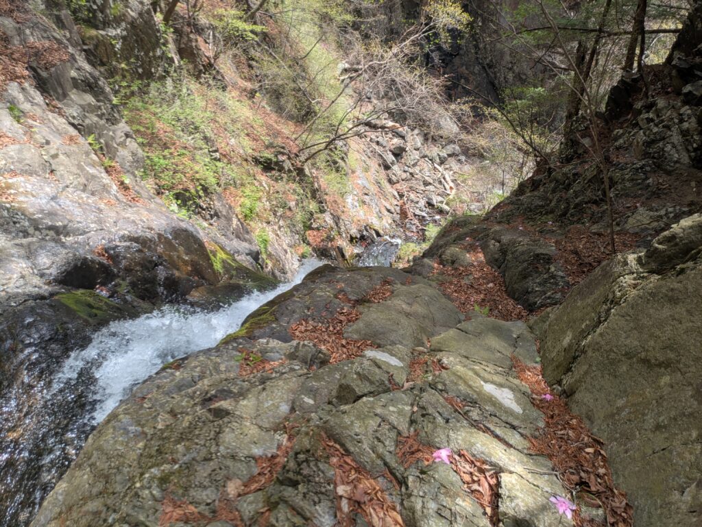 ひとまず2段目は大変そう。1段目は登れそうだが、春先から水浴びしたくないので巻く。2段目は滝の横にバンドが繋がっているが、単独ということもあってビビって弱点を探りながら遠回りすると、その上にも良い感じにバンドがあって落ち口に簡単に出られた。