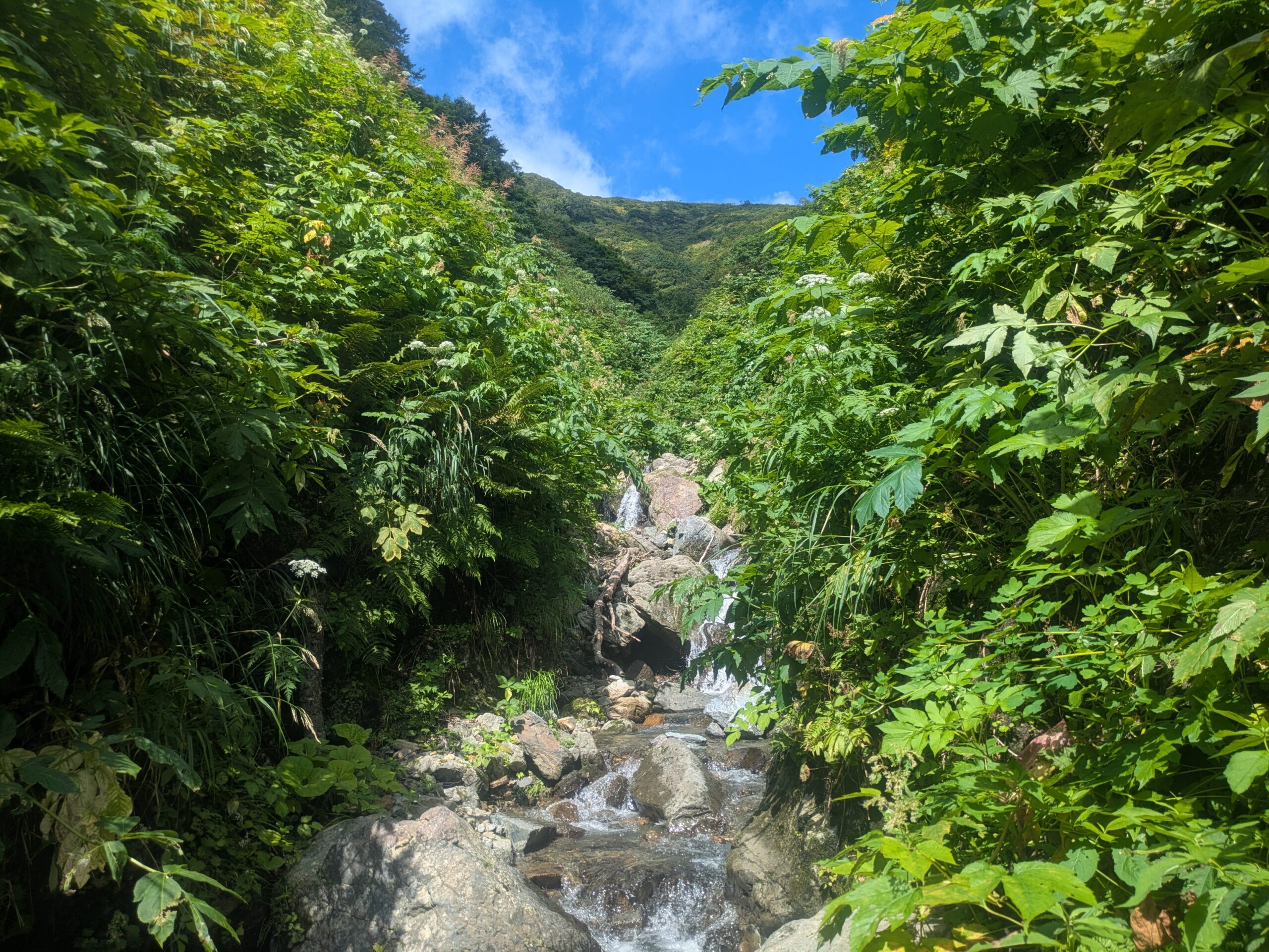 サブウリのゴルジュを抜けた先にソバナが可憐に咲いていて癒される。ブナ、トチノキ、サワグルミの美しい森に男2人で思わず歓声をあげ、ジムグリと戯れたりしているといつの間にか大幽西ノ沢との出合。