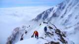 やむを得ず空身で登って荷揚げを強いられた5m滝の他は問題なく進み、13時前にCo1723mのピークに到達。驚いたことに稜線直下20mまで水が出ていた。豪雪でひん曲がったダケカンバに登って丸山岳を眺め、行動食を頬張った。