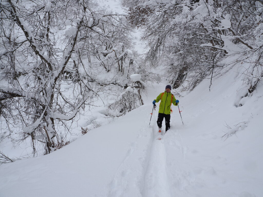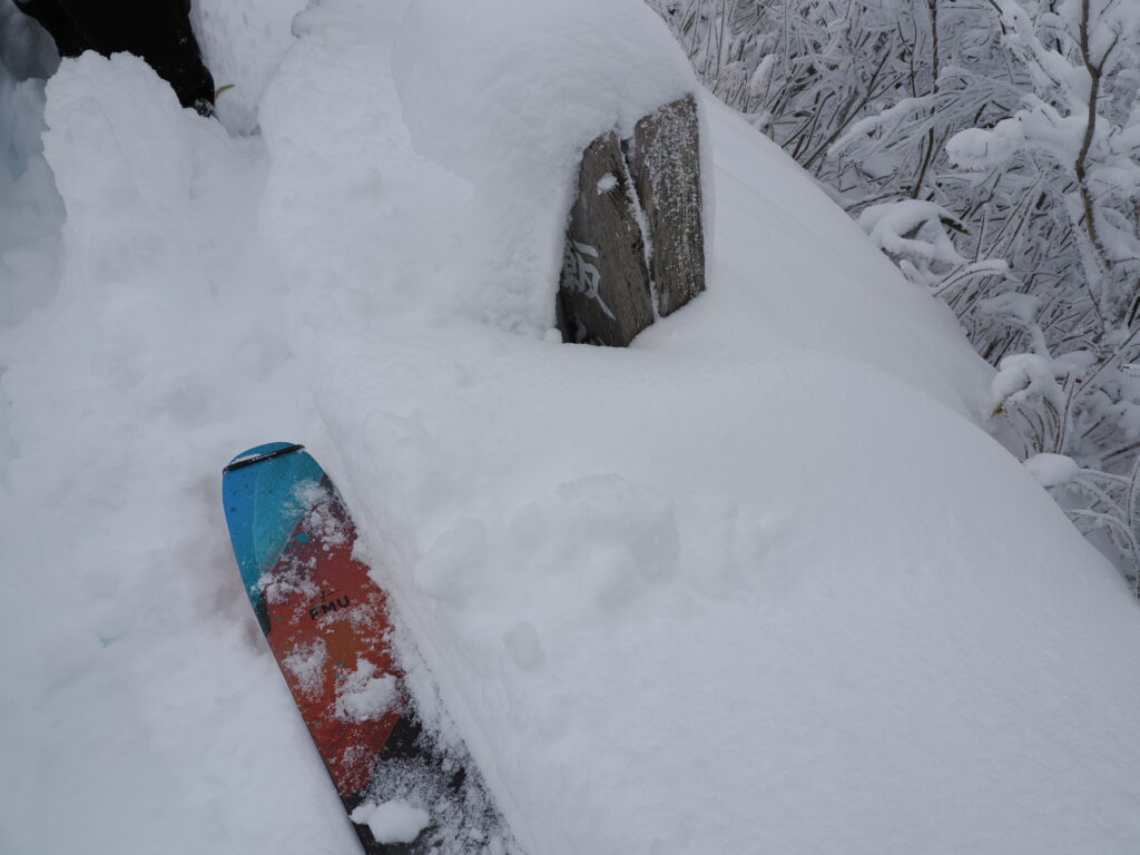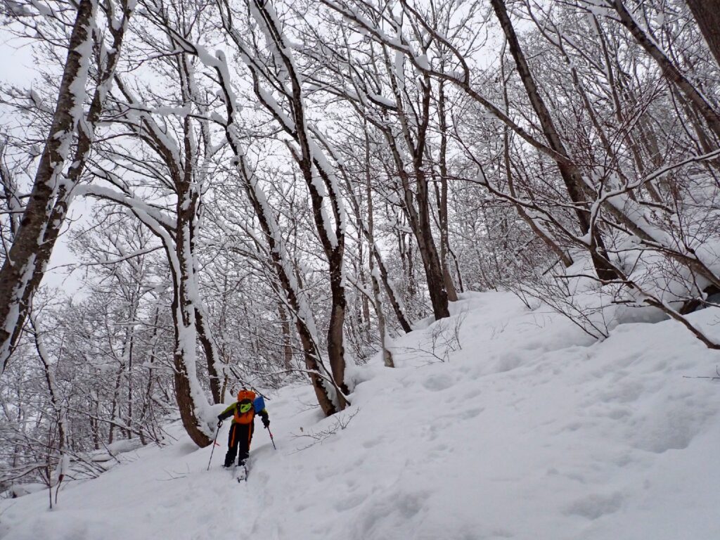 麓の集落にそそくさと車を置いて、スキーをつけて歩く。林道のラッセルをこなし、東屋のある公園を横目に進む。惰性で林道を進むと目処を付けていた尾根を過ぎてしまった。傾斜の強い登山道の尾根に吸い込まれたが、まあどうにでもなる。ガシガシ登っていくとやがて緩やかな若いブナの尾根になって、あっさり山頂に出た。
