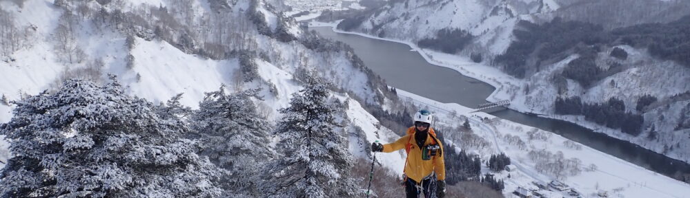 只見の街を背にスカイラインをグイグイ進んで、核心部である左耳の下部に立つ。ここから1ピッチロープを出した。ブッシュが出ていて支点は豊富だ。wachinia氏曰く「ミニ戸隠」との事である。